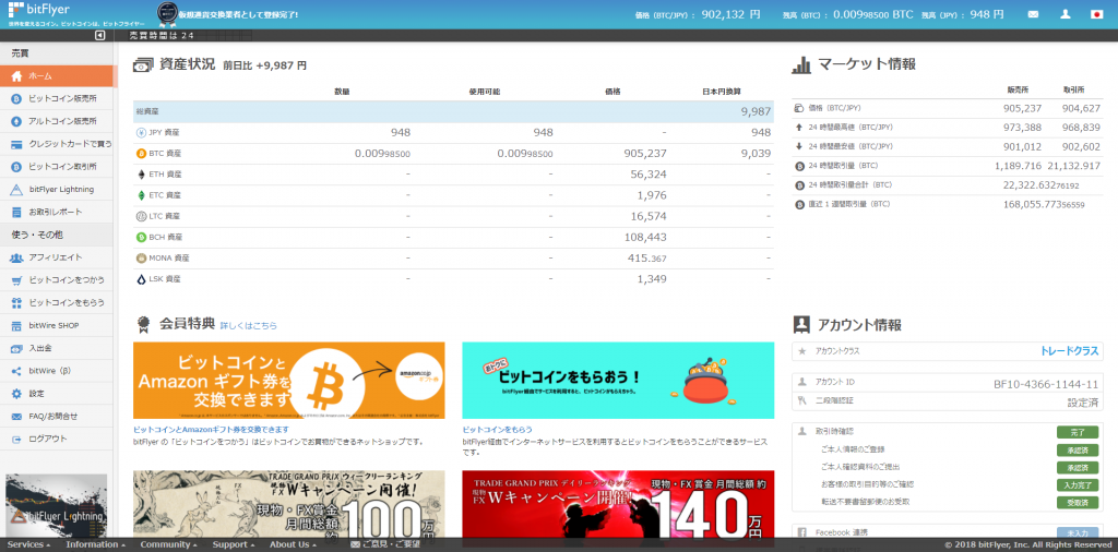 というわけで、先日本人確認の書類も無事受領できた仮想通貨取引所「bitflyer」にてお試し的にBTCを購入してみました。